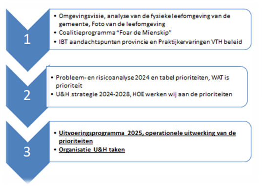 Het programma is een vervolgstap op de uitwerking van de U&H strategie 2024-2028 en de daarbij behorende risicoanalyse 2024. Dit uitvoeringsprogramma hoort bij deze eerder in 2024 ontwikkelde beleidsdocumenten. In dit document wordt alleen de wettelijk verplichte1 vervolgstap het uitvoeringsprogramma en bijbehorende organisatie uitgewerkt. Voor de achtergronden van het programma verwijzen wij naar de documenten uit stap 1 en 2 in onderstaand schema: de dwarsverbanden en logische volgorde van de beleidsonderdelen. Dit document betreft het resultaat van stap 3.