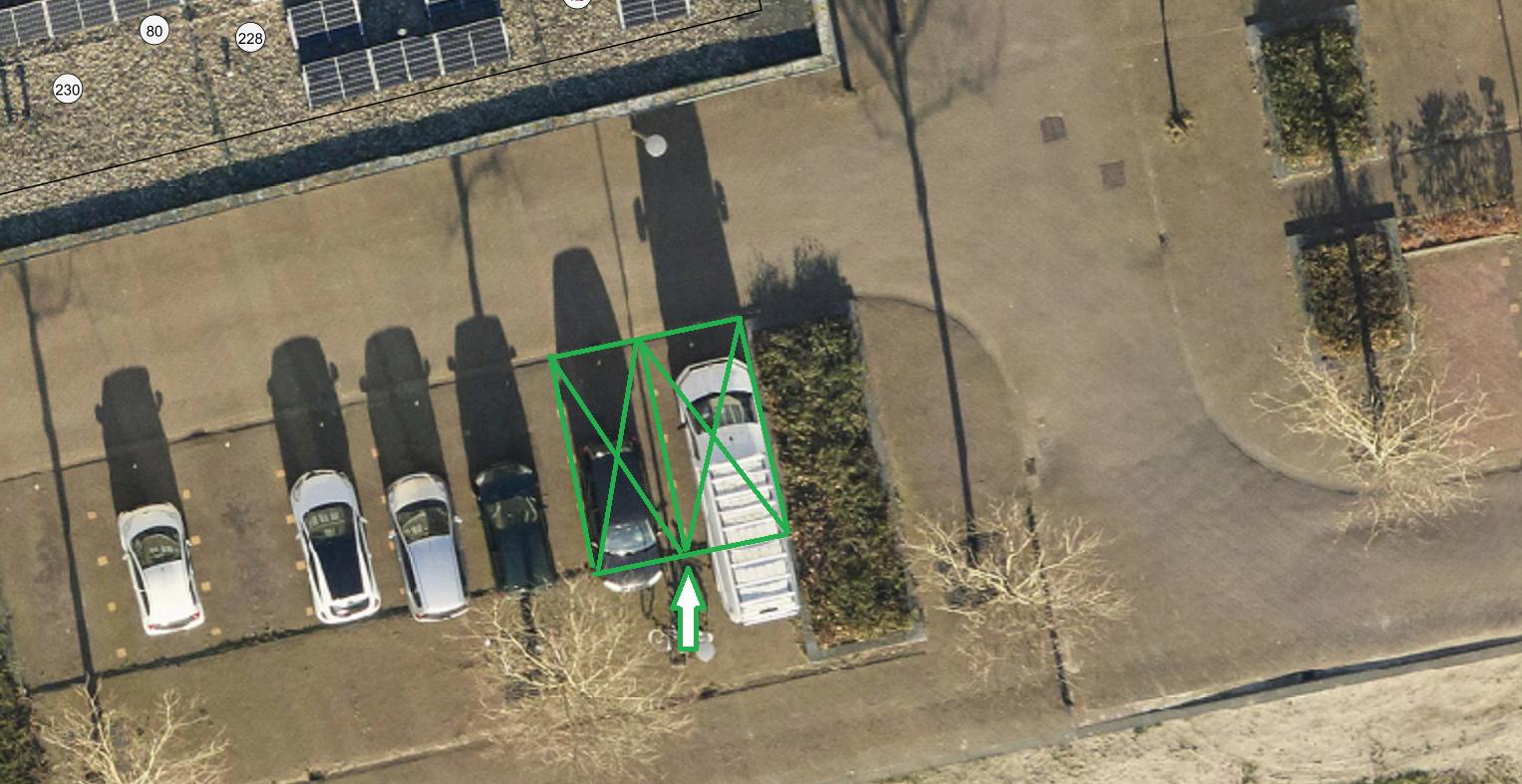 De parkeerplaatsen zijn alleen bedoeld voor het opladen van elektrische auto’s. Daarom plaatsen we het verkeersbord E08c (dit staat in bijlage I van het RVV 1990). We plaatsen ook het verkeersbord OB504 daaronder. Dit is een bord met twee pijlen die wijzen naar de parkeerplaatsen.
