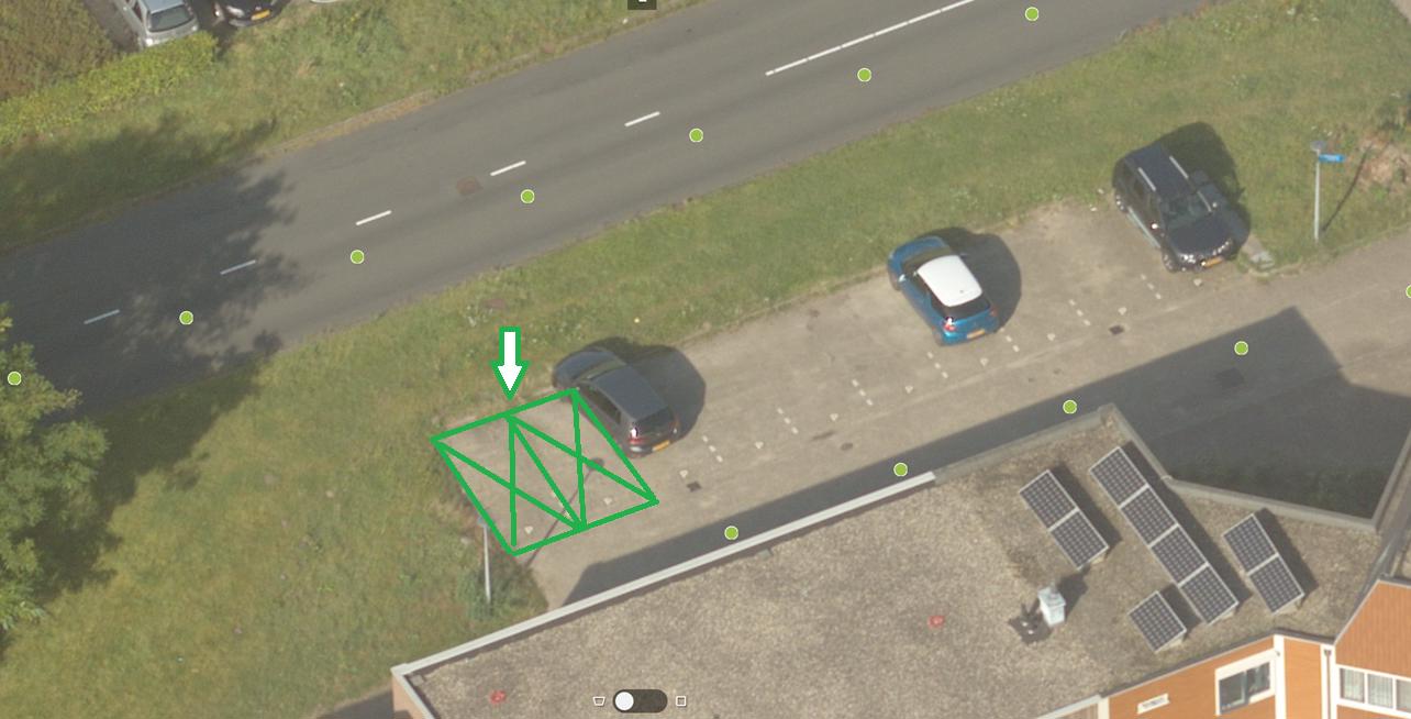 De parkeerplaatsen zijn alleen bedoeld voor het opladen van elektrische auto’s. Daarom plaatsen we het verkeersbord E08c (dit staat in bijlage I van het RVV 1990). We plaatsen ook het verkeersbord OB504 daaronder. Dit is een bord met twee pijlen die wijzen naar de parkeerplaatsen.