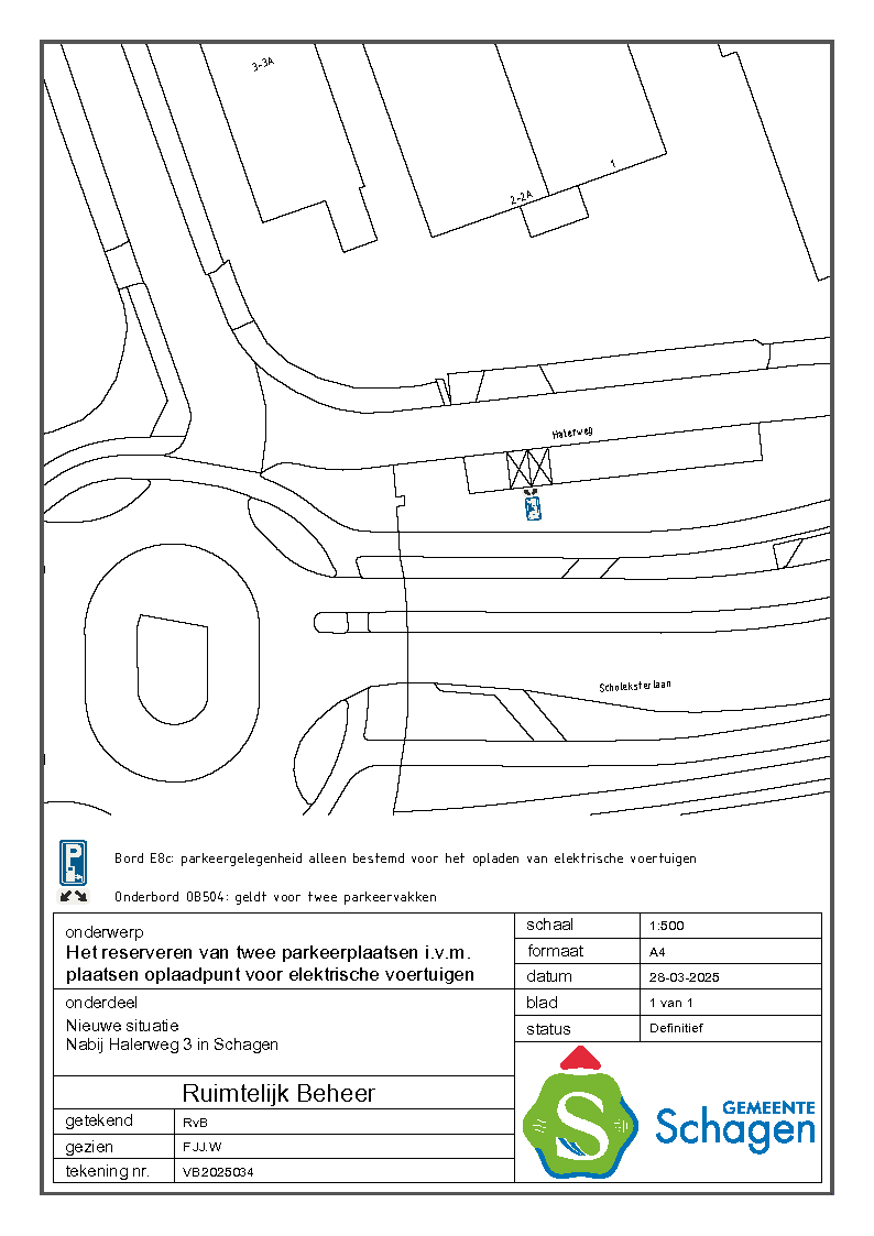 Gemeente Schagen- Verkeersbesluit reserveren van 2 parkeerplaatsen voor het opladen van elektrische voertuigen nabij Halerweg 3, Schagen.