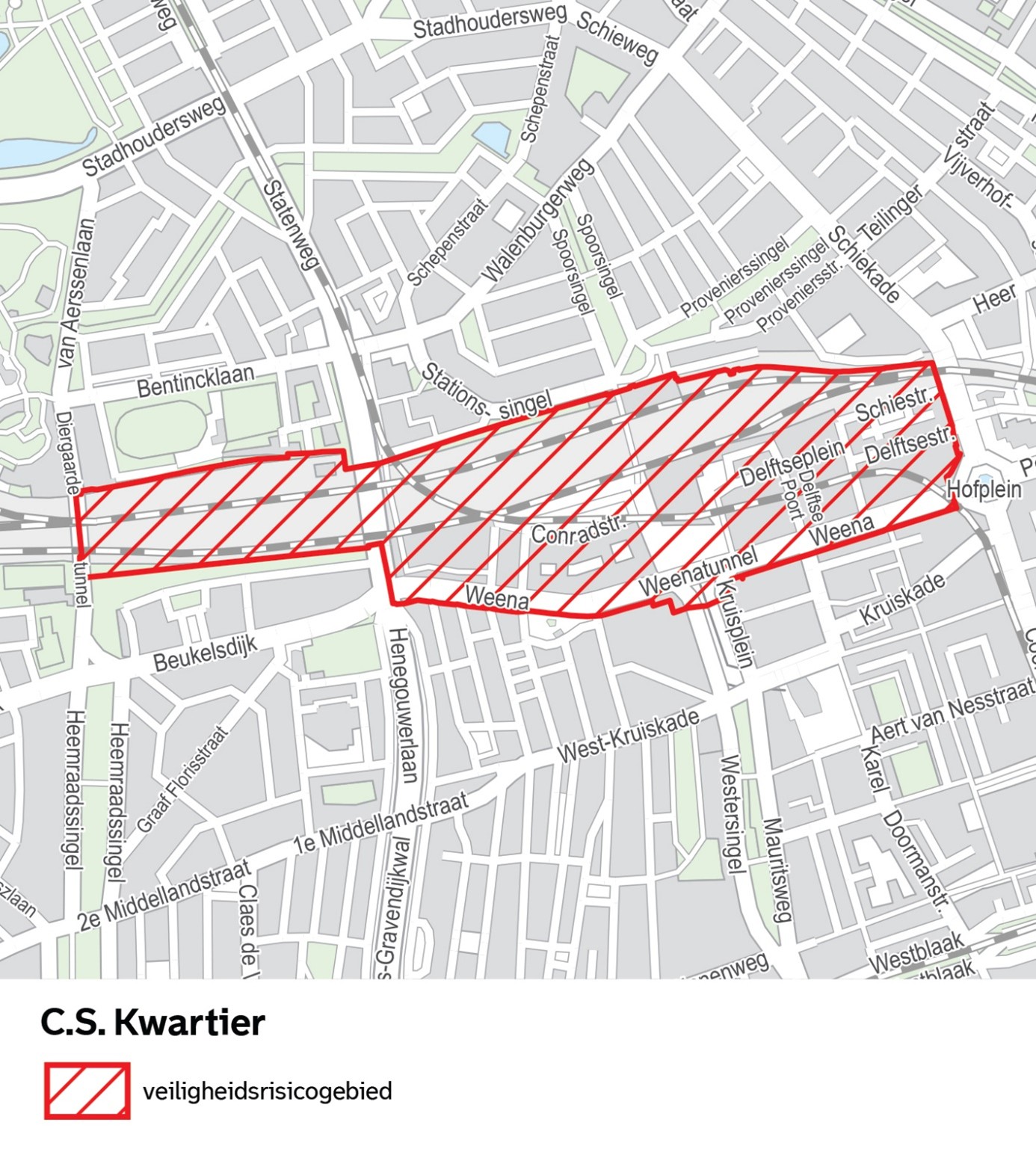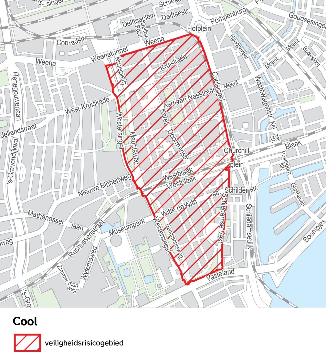 Het veiligheidsrisicogebied Centrum, zoals aangegeven op de kaarten in bijlage 1, omvat de CBS wijken Oude Westen, Cool, Dijkzigt, Nieuwe Werk – uitgezonderd het gebied Het Park en het gebied binnen de straten Baden Powellaan, Heuvellaan, Westerkade, Veerhaven, Westmaaslaan, Westzeedijk tot aan de Baden Powellaan – Stadsdriehoek en C.S.-Kwartier, begrensd door de Parkhaven, Westzeedijk, ’s-Gravendijkwal, Henegouwerlaan, Weena, Conradstraat, Centraal Station Rotterdam, Delftseplein, Schiestraat, Schiekade, Couwenburg, Pompenburg, Goudsesingel, Oostplein, Oosterkade, Nieuwe Maas, de genoemde wegen, alle OV-knooppunten en locaties daaronder begrepen.