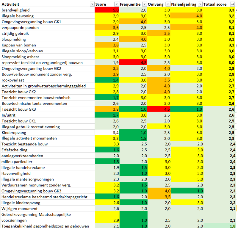 We hebben een omgevingsanalyse en risicoanalyse opgesteld op te kunnen prioriteren in de uitvoering. De risicoanalyse biedt een kader voor prioritering op basis van de impact en ernst van activiteiten. Activiteiten zoals brandveiligheid en bouwtoezicht krijgen hierbij hoge prioriteit vanwege de grote gevolgen voor veiligheid en leefbaarheid. Bestuurlijke weging en samenwerking met ketenpartners, zoals de omgevingsdienst en politie, vullen deze prioritering aan.