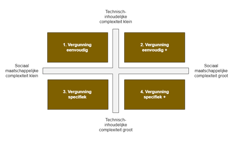 In combinatie met de technisch-inhoudelijke complexiteit en de sociaal-maatschappelijke complexiteit leidt dit tot vier typen vergunningen: