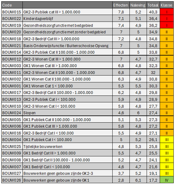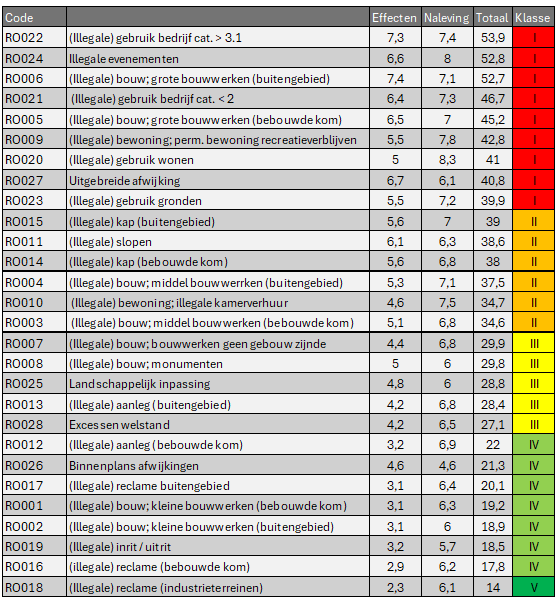 Op basis van eigen ervaringen en bestuurlijke prioriteiten is de totaal score bepaald op basis van een 5-punten schaal. Deze schaal loopt van ‘een zeer groot risico’ tot en met ‘zeer klein risico’. Dit leidt uiteindelijk tot een volledige risicoanalyse voor zowel vergunningverlening als toezicht en handhaving. De resultaten zijn doorvertaald in de strategieën zoals opgenomen in dit beleid en de jaarlijkse uitvoeringsprogramma’s.