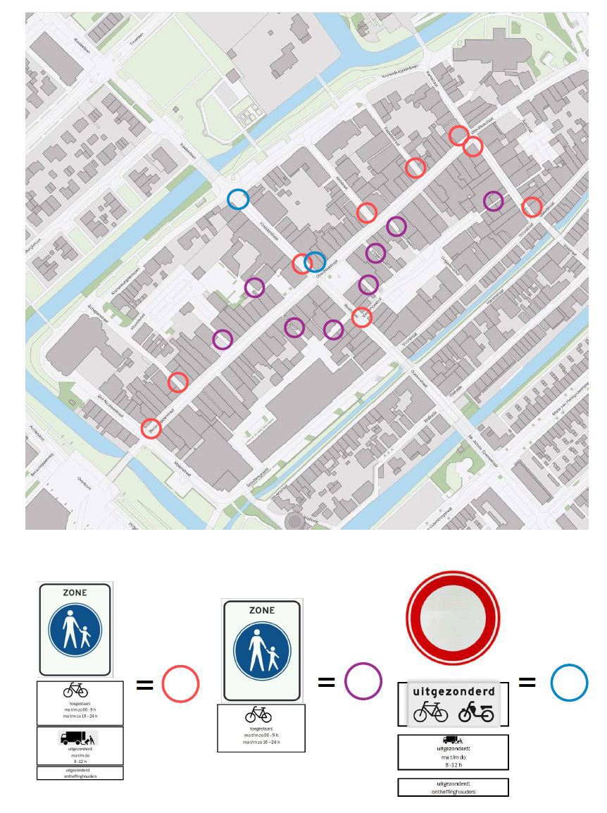 3. In verband met het besluit genoemd onder 1, vervangen we de borden G7zb met onderborden op de Kloosterstraat nabij het Kronenburgplantsoen door het bord C1 met onderborden OB54 zoals in de tekening is aangegeven. (m.u.v. bromfietsers/m.u.v. laden en lossen gedurende de toegestane tijden conform andere onderborden/m.u.v. ontheffingshouders)