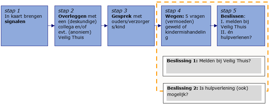 Onderstaand figuur toont de vijf stappen uit de Meldcode huiselijk geweld en kindermishandeling. Ter ondersteuning van de beslissingen in stap 5 is in stappen 4 en 5 een afwegingskader toegevoegd.
