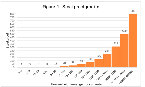 De AQL-methodiek maakt het mogelijk om te bepalen welke steekproefgrootte tot betrouwbare resultaten leidt en welke norm gehanteerd moet worden voor acceptatie en afkeuring. Figuur 1 laat zien welke steekproefgrootte er bij welke hoeveelheid moet worden toegepast. Bijvoorbeeld, wanneer Peelgemeenten 600 documenten heeft vervangen, moet er een steekproefcontrole uitgevoerd worden op 80 documenten.