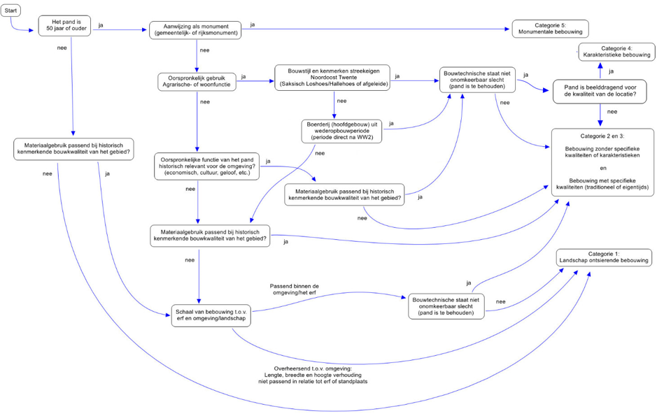 Het uitgangspunt van dit kader en het beleid waarop dit kader gebruikt wordt is het verhogen van de ruimtelijke kwaliteit en het stimuleren van het in stand houden van historisch relevante bebouwing. Deze bebouwing draagt bij aan de kwaliteit, herkenbaarheid en beleefbaarheid van het gebied Noordoost Twente en haar historie. Authenticiteit van de buitenzijde is hierin belangrijk, zowel in materiaalgebruik als in opbouw en vormgeving. Het interieur is in de bepaling van categorisering ondergeschikt.De toetsing is maatwerk per gebouw. De gemeente kan zich bij het bepalen van de categorisering laten adviseren door het Q-team en/of de stadsbouwmeester.