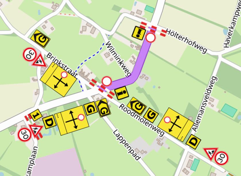 dat in verschillende fasen een maximumsnelheid van 30 km/u en een waarschuwing tot werk in uitvoering zijn, op;