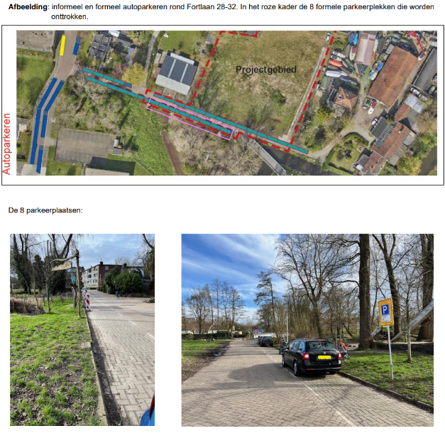 In 2022 is onderzoek gedaan naar het gebruik van de parkeerplaatsen op de Fortlaan. De parkeerdruk op de Fortlaan ligt gemiddeld onder de 40%. Er wordt alleen geparkeerd op de formele parkeerplekken aan de zuidzijde en niet geparkeerd op de 19 informele parkeerplaatsen (noordzijde). Het piekmoment is op zaterdag 08:00-12:00 met een bezetting van 50% van de formele parkeerplaatsen (7 parkeerplaatsen). De verwachting is dat de zaterdag voor de Fortlaan het drukst blijft. Dit in verband met het bezoekersparkeren van de scouting en het speelbos. Op andere dagen is de parkeerdruk lager. Elders in de wijk is de parkeerdruk 78% waarbij een parkeerdruk tot en met 80% acceptabel is. Dit biedt sowieso nog ruimte voor het opheffen van parkeerplaatsen op de Fortlaan. En omdat het gaat om bewoners die de Fortlaan kennen en weten dat hier parkeerruimte is maar toch geen gebruik hiervan, mag verwacht worden dat de parkeerdruk verderop in de wijk beperkt toeneemt.