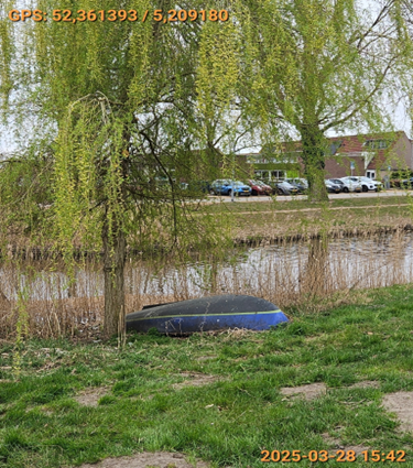 Op het gras in de Edestraat ter hoogte van huisnummer 11 te Almere is een blauw met zwart gekleurd vaartuig met een groene streep in midden geplaatst in strijd met het bepaalde in artikel 2:6 van de Algemene Plaatselijke Verordening (APV 2011)