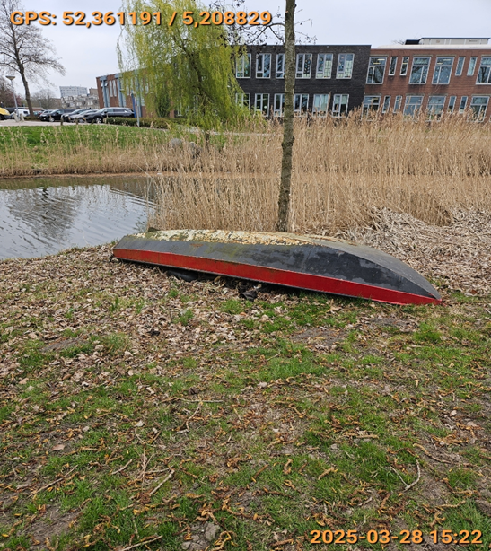 Op het gras in de Venloweg ter hoogte van basisschool De Driemaster te Almere is een rood met zwart gekleurd vaartuig geplaatst in strijd met het bepaalde in artikel 2:6 van de Algemene Plaatselijke Verordening (APV 2011)