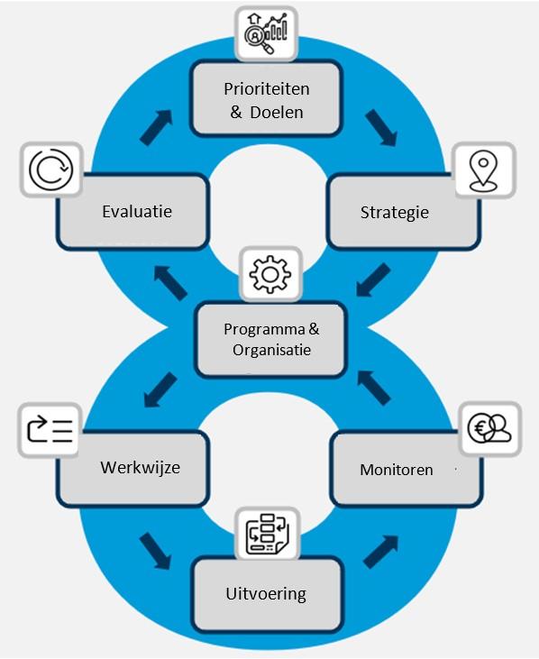 Op de volgende pagina schematiseren we de stappen van de BIG8-cyclus in een leeswijzer en leggen we per icoon uit waar we in het hoofdstuk inhoudelijk op ingaan.