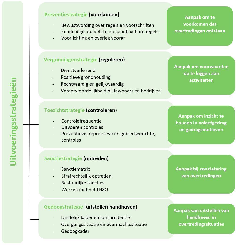 In de figuur hieronder is de samenhang tussen de uitvoeringsstrategieën weergegeven. Elke uitvoeringsstrategie is nader uitgewerkt met verschillende uitgangspunten: