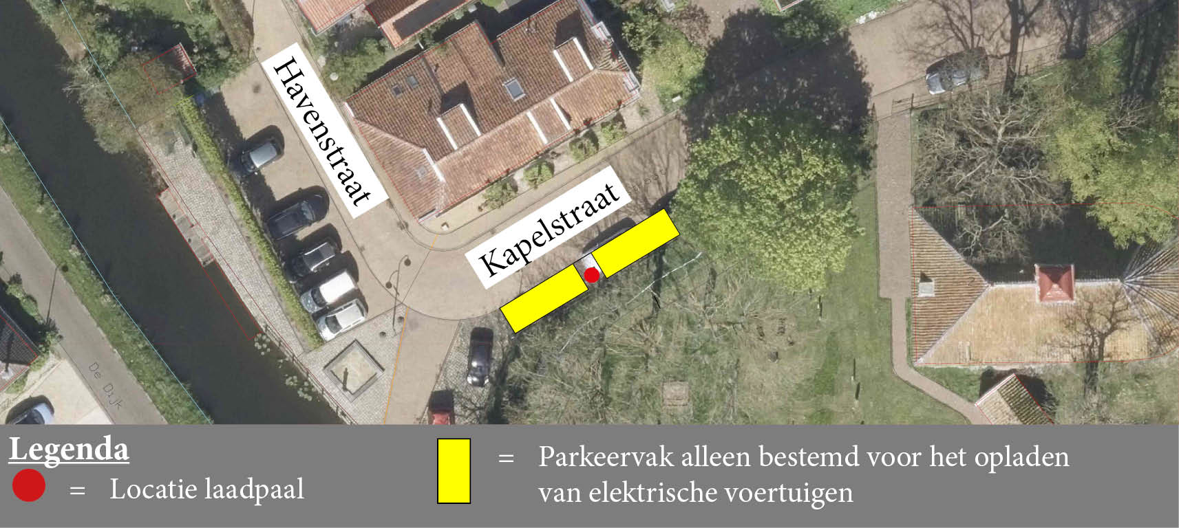 Wij besluiten op grond van bovenvermelde overwegingen twee parkeervakken, bij de laadpaal aan de Kapelstraat tegenover nummer 1, aan te wijzen als parkeervakken alleen bestemd voor het opladen van elektrische voertuigen. Dit doen wij middels plaatsing van bord E8c uit bijlage 1 van het RVV 1990 met een onderbord (conform artikel 8 BABW) met daarop eerst één pijl (wijzend naar rechts), waaruit blijkt dat het bord voor één parkeervak van toepassing is en de tweede pijl (wijzend naar links) aan te brengen als hiertoe een aanvraag binnen twee jaar na publicatie van dit verkeersbesluit voor ingediend wordt.