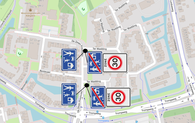 - de straat Ter Wadding wordt aangegeven als erf door middel van het plaatsen van verkeersborden G5 en G6 van bijlage 1 van het RVV 1990 ter hoogte van de beide kruispunten met De Zeven Provinciën;