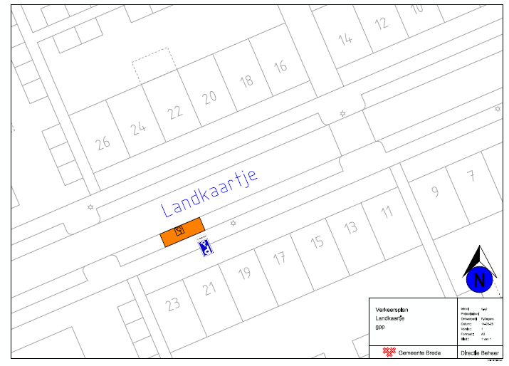 Een gehandicaptenparkeerplaats op kenteken aan te wijzen op het Landkaartje ter hoogte van huisnummer 21 te Breda. Een en ander zoals weergegeven op de bijgevoegde tekening ‘Verkeersplan Landkaartje gpp’.