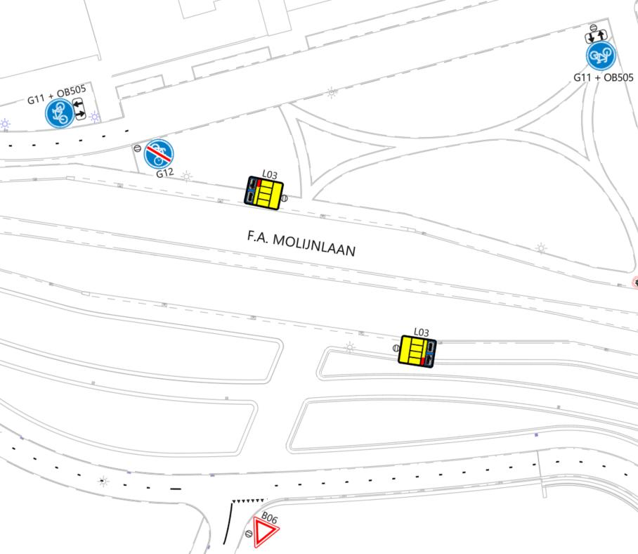 Tot plaatsing van bord D02-RO uit bijlage 1 van het RVV 1990 in de middengeleider van de F.A. Molijnlaan nabij F.A. Molijnlaan 1;