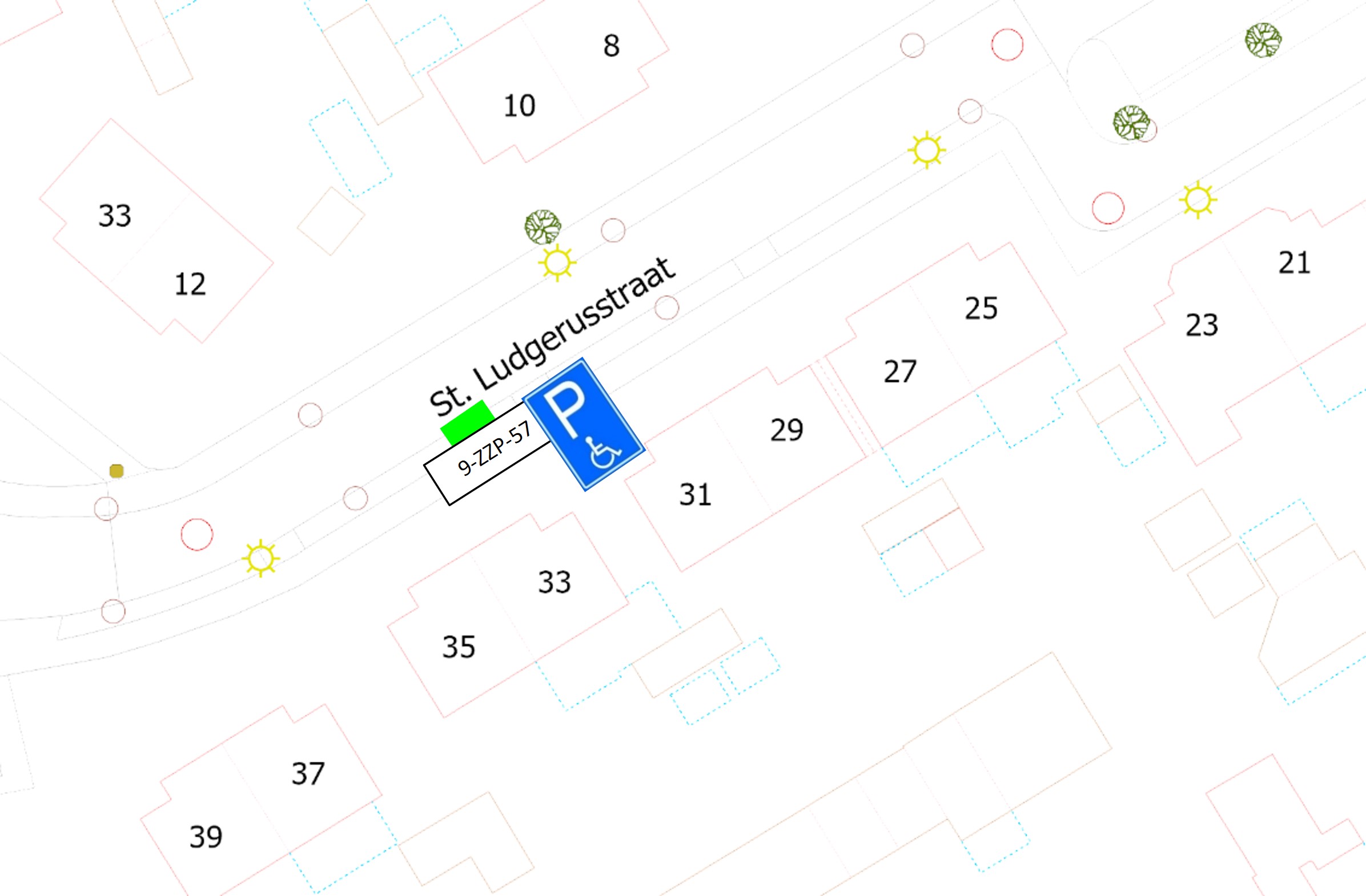Het aanwijzen en inrichten van een gehandicaptenparkeerplaats op kenteken aan de St. Ludgerusstraat, ter hoogte van perceel 33, door het plaatsen van het verkeersbord E6 van het RVV 1990 met onderbord met kenteken 9-ZZP-57, zoals is aangegeven op de overzichtstekening in dit besluit.