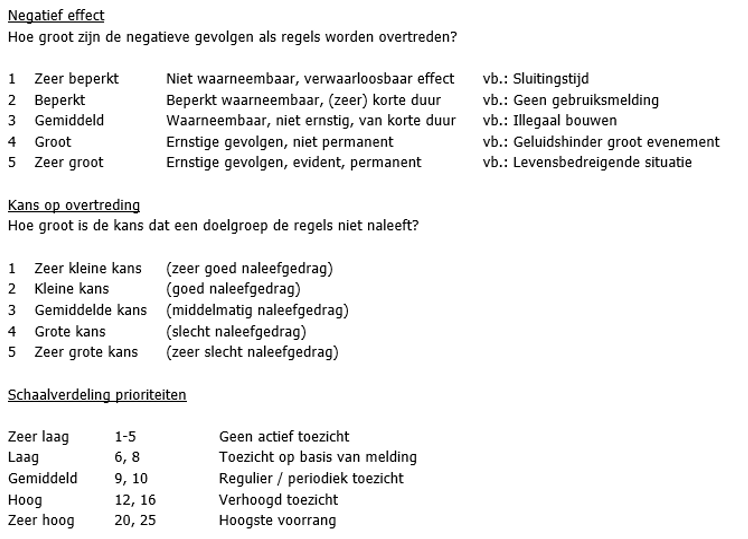 Wanneer voor een bepaalde situatie het negatieve effect en de kans op overtreding bepaald zijn, kan het risico worden bepaald. Het risico (R) is berekend door NE x K = R. De waarde van R is gekoppeld aan een prioriteit, van Zeer Laag tot Zeer Hoog. Onderstaande is geïllustreerd hoe wordt gewerkt met de schaalverdeling: