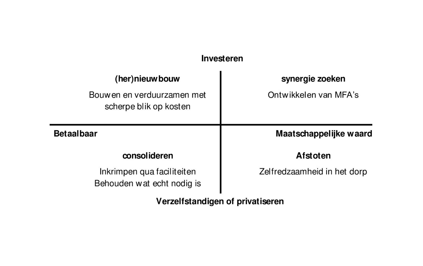 Toch behoort externe verzelfstandiging of privatisering wel tot de mogelijkheden, zoals eerder ook in Wijster en Witteveen heeft plaatsgevonden. Net als bij MFA’s is het ook bij externe exploitatie (ook wel verzelfstandiging genoemd) of privatisering essentieel om goede afspraken te maken, ook over het beheer en onderhoud op de lange termijn, om te voorkomen dat de voorziening alsnog verloren gaat. Welk van de vier scenario’s ook gekozen wordt, uiteindelijk gaat het om goede integrale afweging van kosten en maatschappelijke baten, een duurzame blik op de toekomst en het ontwikkelen van een goede samenwerking met alle gebruikers.