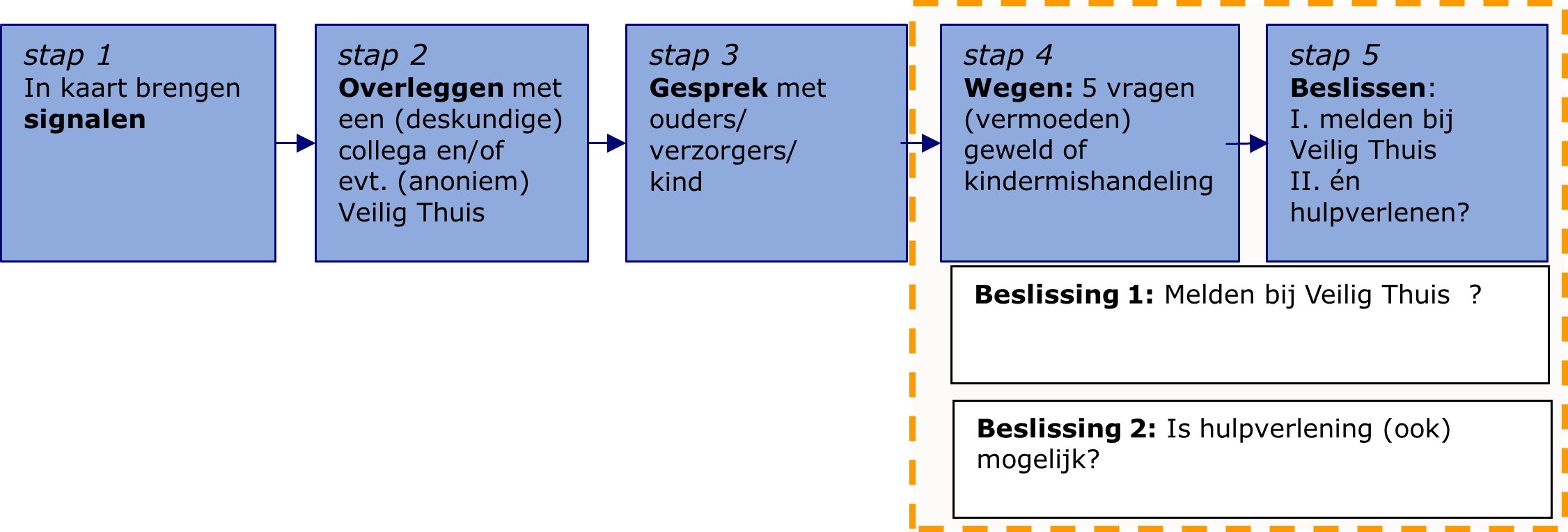Onderstaand figuur toont de vijf stappen uit de Meldcode huiselijk geweld en kindermishandeling. Ter ondersteuning van de beslissingen in stap 5 is in stappen 4 en 5 een afwegingskader toegevoegd.