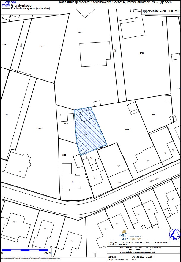 De verkoop betreft een perceel, gelegen aan de Wilhelminalaan 26, aan de achterzijde met een oppervlakte van ongeveer 300 m2, kadastraal bekend gemeente Stevensweert, sectie A, nr. 2882.