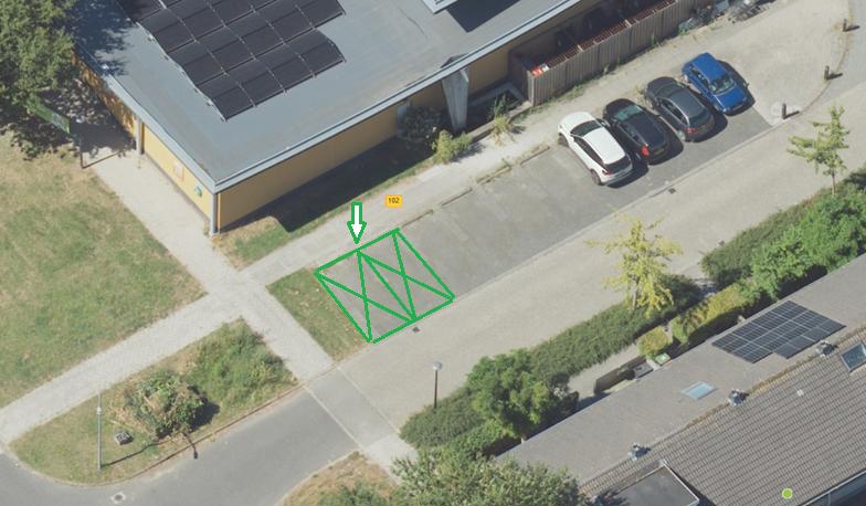 De parkeerplaatsen zijn alleen bedoeld voor het opladen van elektrische auto’s. Daarom plaatsen we het verkeersbord E08c (dit staat in bijlage I van het RVV 1990). We plaatsen ook het verkeersbord OB504 daaronder. Dit is een bord met twee pijlen die wijzen naar de parkeerplaatsen.