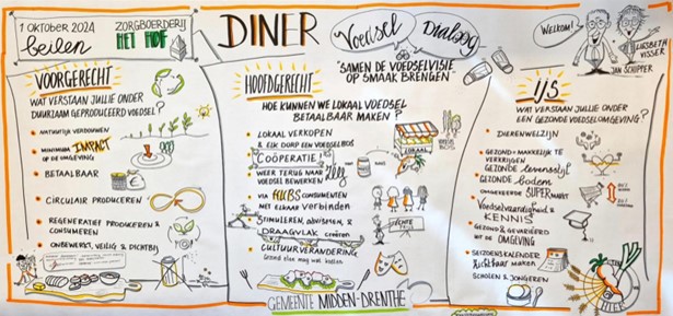 Met een gemixte tafelsetting hebben we invulling gegeven aan een unieke werkvorm: een 3 gangen diner met elke gang een specifieke vraag over de voedselvisie. Wat verstaan jullie onder duurzaam geproduceerd voedsel? Hoe kunnen we lokaal voedsel betaalbaar maken? Wat verstaan jullie onder een gezonde voedselomgeving? De gasten gingen tijdens een gang met elkaar in dialoog over deze vragen. Van elke ronde werd de output vastgelegd in een tekenplaat die live werd vormgegeven door een tekenaar.