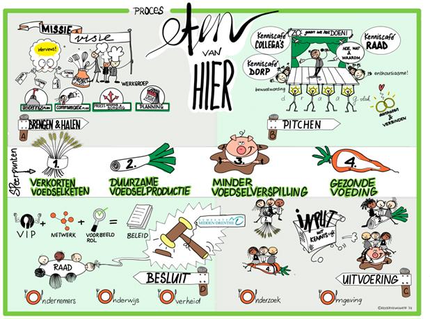 De voedselvisie is een document waarin wij onze visie en doelstellingen op het gebied van voedsel hebben vastgesteld. Eten van Hier is de start van een beweging die impact gaat hebben in de regio. Een beweging die zich over organisatiegrenzen heen gezamenlijk inzet voor een gezonde, sociale en duurzame voedselketen in Midden-Drenthe. Het is een bundeling van bestaande initiatieven en een impuls voor nieuwe projecten. Waar nodig en waar het past wordt de verbinding gezocht met de provincie en het rijk.
