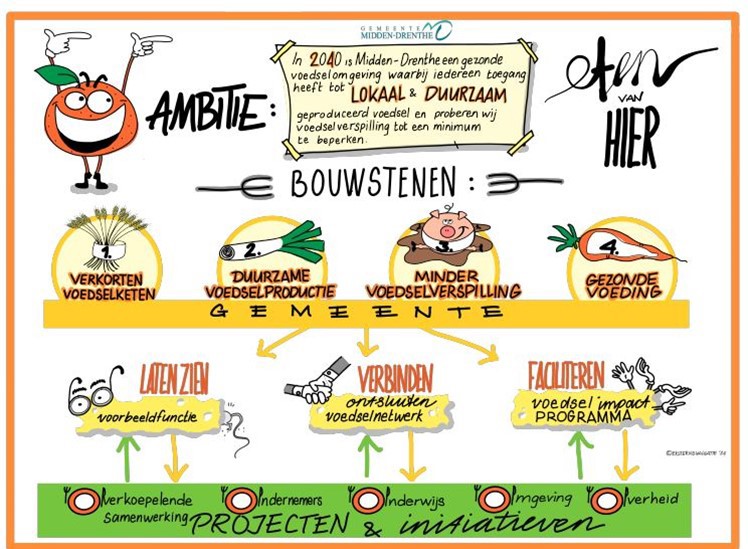 Voedsel verbindt thema’s, sectoren, organisaties en bovenal mensen. Midden-Drenthe is een gemeente met veel voedsel gerelateerde organisaties. Van boeren tot restaurants, van scholen tot verwerkende industrie en in toenemende mate initiatieven van inwoners, zoals buurtmoestuinen en voedselbossen. Voedsel is voor iedereen van belang en met deze visie willen wij zoveel mogelijk inwoners, bedrijven, instellingen en ook beleidsdomeinen binnen onze eigen organisatie enthousiast maken om zo mee te bouwen aan onze bouwstenen binnen de voedselvisie.