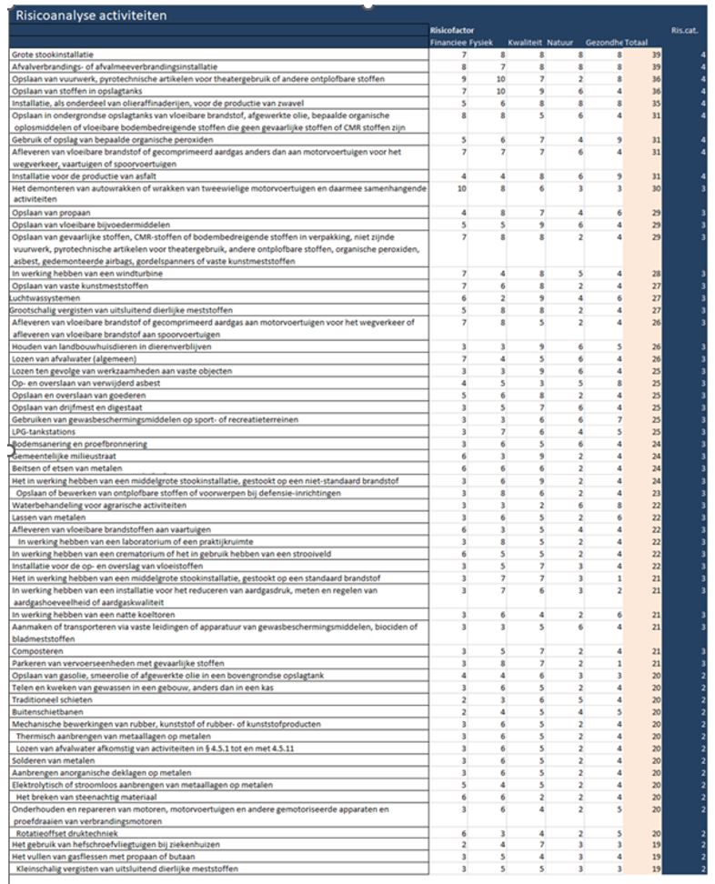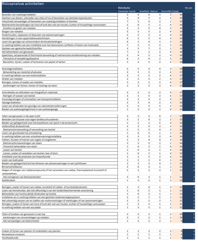 Deze aspecten leiden met een weging van het potentieel nadelige effect tot een risicocategorie per branche. Het totaal van de risicofactoren leidt tot een risicoscore, waarbij een indeling is gemaakt in: