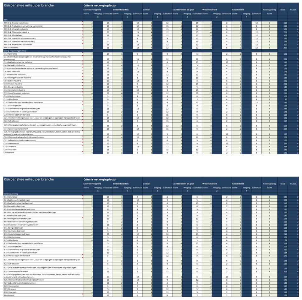 De bedrijven zijn per groep gerubriceerd naar branches. Dit betreft: 1) bedrijven met een IPPC-installatie, 2) bedrijven met vergunningplichtige milieubelastende activiteiten en 3) bedrijven met informatie- en meldingsplichtige milieubelastende activiteiten. Ieder van de branches is gescoord (van waarde 1 zeer lage kans tot waarde 5 zeer hoge kans) op de volgende milieuaspecten.