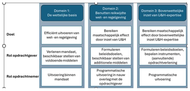 In het rapport ‘Handreiking Outcome gericht werken’ , d.d. 21 november 2023, worden drie domeinen genoemd die helpen om op een opdracht te monitoren en hierover te rapporteren. Deze domeinen worden vanaf 2024 door het IBP VTH verder geïntroduceerd bij omgevingsdiensten. In bijlage 1 worden de domeinen nader toegelicht.