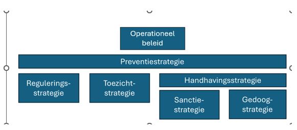 Het strategisch beleid (wat willen we bereiken?) werkt door naar operationeel beleid (hoe willen we dit bereiken?). Dit operationeel beleid is uitgewerkt in enkele deelstrategieën. Dit betreft: de preventiestrategie, de reguleringsstrategie, de toezichtstrategie, en de handhavingsstrategie (die bestaat uit de sanctiestrategie en de gedoogstrategie). Deze strategieën opereren naast elkaar, en sluiten elkaar niet uit. Bij het opstellen van het uitvoeringsprogramma wordt bepaald welke verhouding tussen de strategieën voor het betreffende jaar het meest aangewezen is. Dit gebeurt in overleg tussen de deelnemers en de FUMO. De methodiek van de ‘Tafel van Elf’, waarbij in eerste instantie aandacht uitgaat naar het voorkomen van overtredingen door zo passend mogelijke preventieve inzet, biedt hiervoor een analysetool.