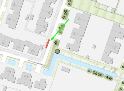 Wereldtuinenlaan (tegenover huisnummer 12; wegvak: tussen Engelsetuinlaan en Binnentuinlaan. Gezien de rijrichting aan de linkerzijde van het wegvak)