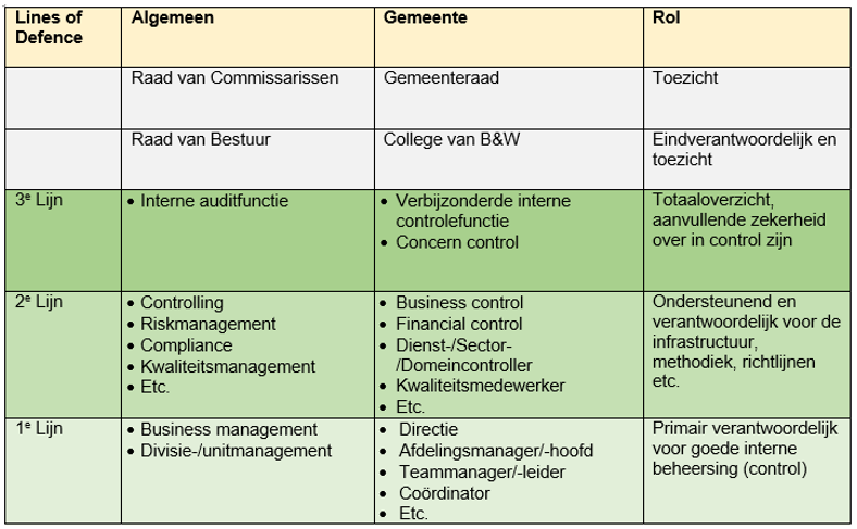 In dit hoofdstuk wordt uiteengezet welke taken en verantwoordelijkheden met betrekking tot informatiebeveiliging en privacy op welke plaats belegd zijn binnen de organisatie. De methodiek sluit aan bij het in de bedrijfsvoering bekende ‘Three Lines Model’ (eerder bekend als ‘Three Lines of Defense’). In dit model is het lijnmanagement verantwoordelijk voor het realiseren van informatiebeveiliging en privacy binnen de eigen processen. De tweede lijn (CISO, security officers, PO) ondersteunt, adviseert, coördineert en bewaakt of het management zijn verantwoordelijkheden ook daadwerkelijk neemt. In de derde lijn wordt het geheel door een (interne) auditor en/of FG van een objectief oordeel voorzien met mogelijkheden tot verbetering, hier zit ook de ENSIA coördinator.