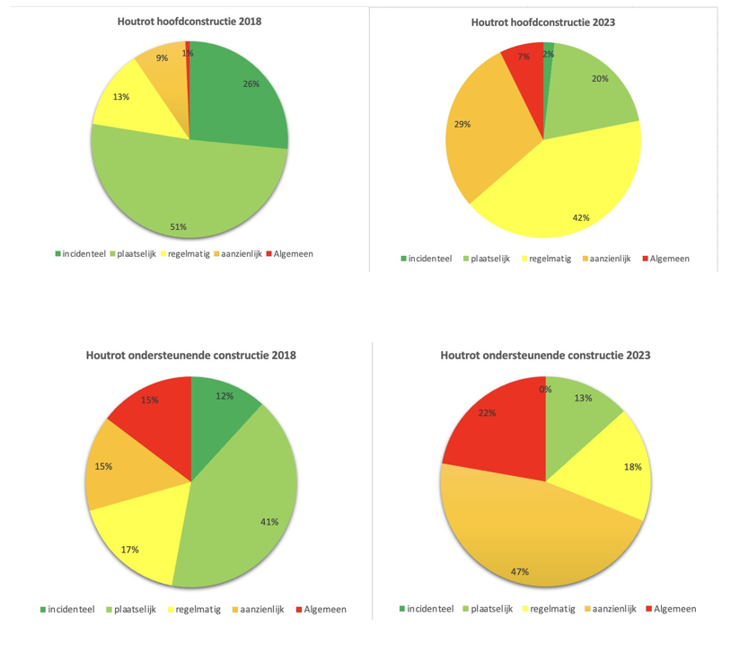 Houtrot is het natuurlijke proces van het degenereren van houten onderdelen van het kunstwerk. Hout wordt zowel voor constructieve als ondersteunende onderdelen gebruikt. Deze zijn in aparte cirkeldiagrammen weergegeven.