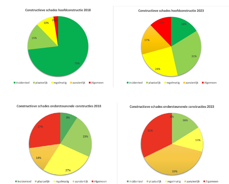Het cirkeldiagram geeft aan in welke mate de objecten waarbij het betreffende schadebeeld is aangetroffen dit vertoont. Op basis hiervan is de ontwikkeling van de schades te volgen, en kunnen de aandachtsgebieden voor het beheerplan 2025-2029 worden uitgelicht.