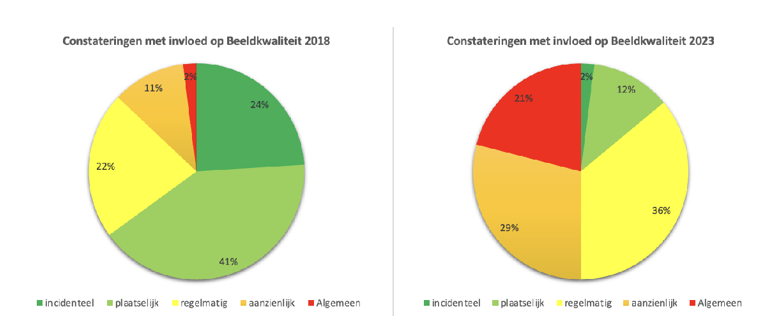 Aan de hand van de cirkeldiagrammen valt op dat het oppervlakten van de verschillende schadebeelden over de gehele linie van het areaal is gegroeid.