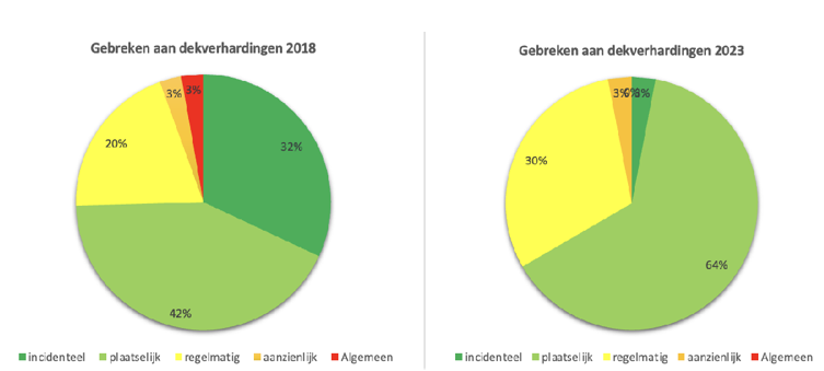 Echter, oppervlakte schades (minder ernstige schades) zijn toegenomen. Dit is goed te zien in bovenstaande tabel en kan op langere termijn lijden tot groter onderhoud en daarmee kapitaalvernietiging. De prioriteiten van het beheerplan, zoals risicobeheersing en kwaliteitsverbetering, zijn succesvol gerealiseerd, maar preventief (klein) onderhoud verdient meer aandacht om toekomstige kapitaalvernietiging te voorkomen. Voor verdere verdieping op de prestaties van de beheerstrategie wil ik u verwijzen naar het stuk in Bijlage I van dit beheerplan.