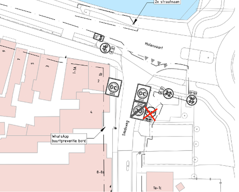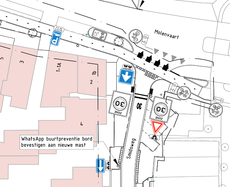 - Door middel van het plaatsen van verkeersbord B6 van bijlage 1 van het RVV 1990, inclusief onderbord met symbool dat aanduidt ‘kruisende fietsers in twee richtingen’, een voorrangsregeling in te stellen op het kruispunt Smidsweg – Molenweg.