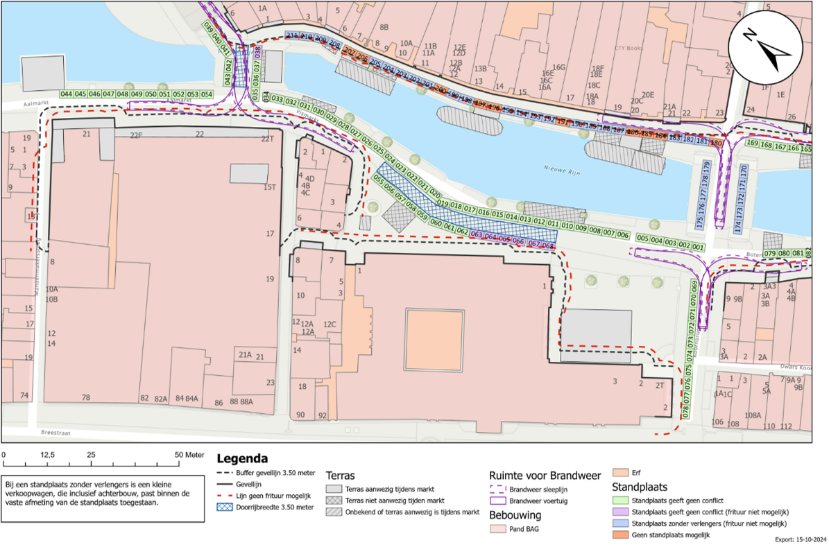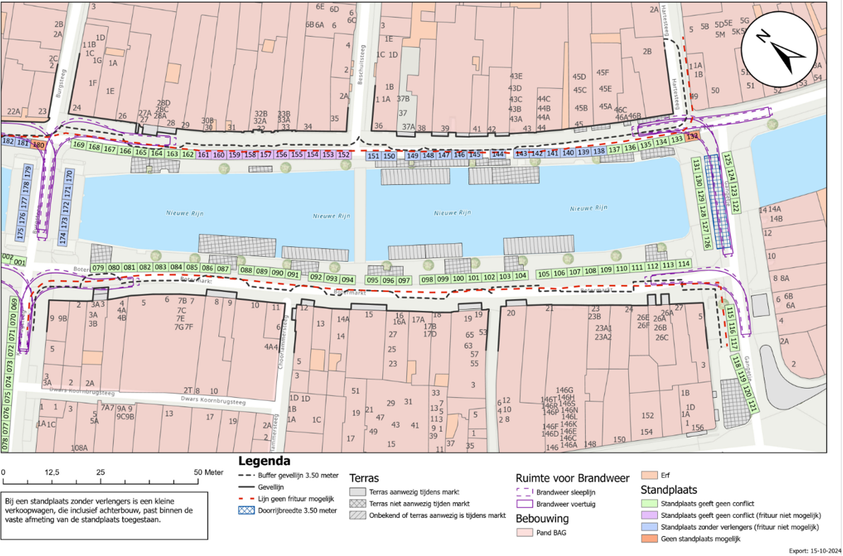 Tevens maakt het college een afweging tussen de afstanden tussen de verschillende functies in het marktgebied zoals retail, horeca en de markt om een minimale afstand van 3,5 meter doorrijbreedte voor de brandweer te garanderen. Hiervoor raadpleegt het college de betrokken marktondernemers, de commissie, de belanghebbende horecaondernemers en de winkeliersvereniging.