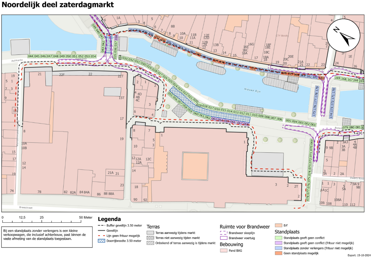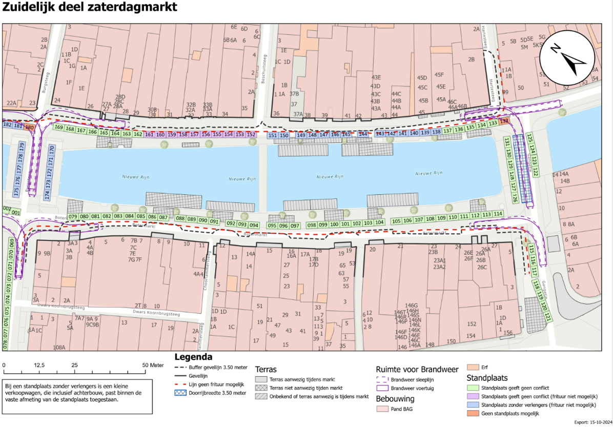 Tevens maakt het college een afweging tussen de afstanden tussen de verschillende functies in het marktgebied zoals retail, horeca en de markt om een minimale afstand van 3,5 meter doorrijbreedte voor de brandweer te garanderen. Hiervoor raadpleegt het college de betrokken marktondernemers, de commissie, de belanghebbende horecaondernemers en de winkeliersvereniging.