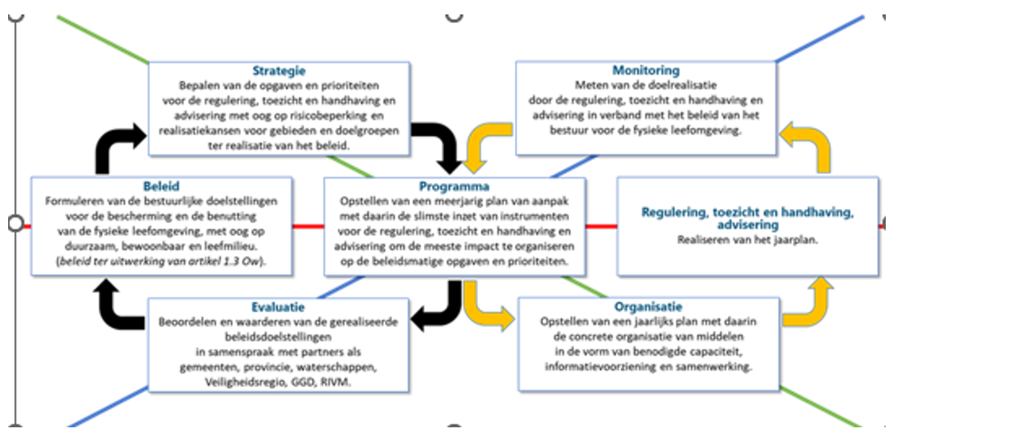 De uitvoerings- en handhavingsstrategie beschrijft op welke wijze de gemeenten en provincie door middel van de basistaken uitvoering willen geven aan de meer strategische ambities die in hoofdstuk 2 staan verwoord. De uitvoerings- en handhavingsstrategie heeft daarmee haar plek in een groter geheel van beleid vanuit de deelnemers; deze relatie wordt verduidelijkt in de beleidscyclus (zie bijlage 1).
