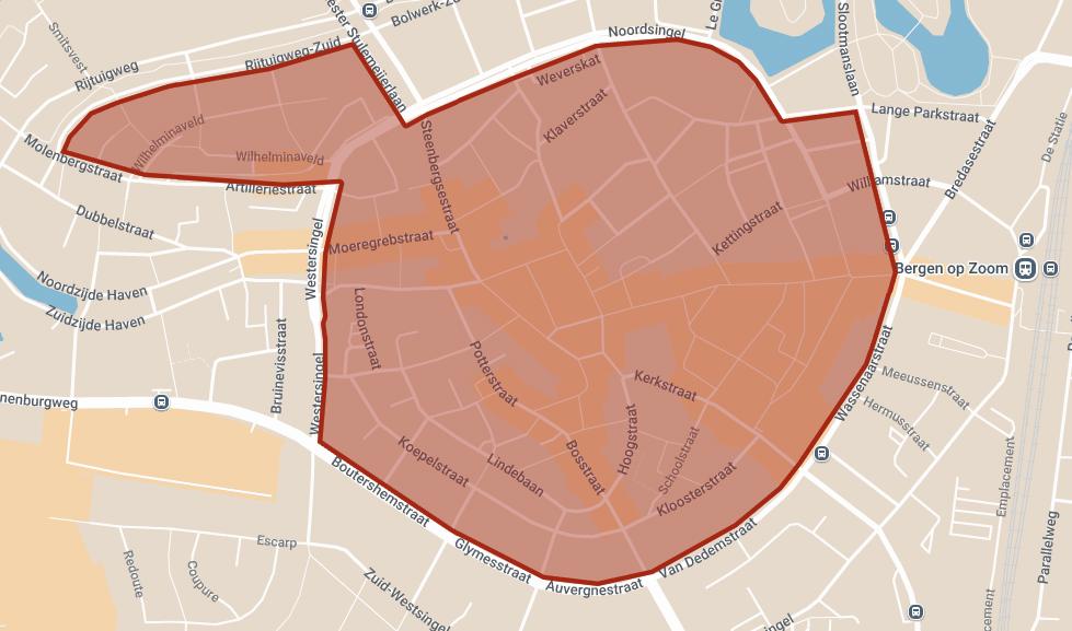 Het centrumgebied bevat het gebied gelegen binnen de volgende straten (deze straten daarbij niet inbegrepen):