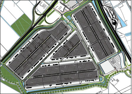 Een belangrijk uitgangspunt van het ruimtelijk ontwerp is dat de bebouwing per ontwikkeleenheid (zie figuur 2) als een ruimtelijke eenheid wordt vormgegeven. Er wordt zo compact mogelijk binnen de ontwikkeleenheid gebouwd (maximale onderlinge afstand 32m) en bedrijven oriënteren zich op de rand van de ontwikkeleenheid en daarmee op de openbare ruimte. Alle laad- en losruimten en kantoorfuncties zitten aan de rand. De ontsluiting en het parkeren van personenauto’s voor werknemers vindt plaats via een binnenstraat centraal in de ontwikkeleenheden. Eenduidige gevellijnen zijn van groot belang om een rustig ruimtelijk beeld te realiseren. Er wordt gestreefd naar een kwalitatieve hoogwaardige architectuur. Doordat de bebouwing geclusterd is en de open voorterreinen grenzen aan de openbare ruimte, zal het Logistiek Park ondanks de hoge dichtheid, als ruim van opzet worden ervaren. De voorterreinen zijn hoofdzakelijk bestemd voor het opstellen van trucks en het laden- en lossen van goederen. In beperkte mate kunnen deze voorterreinen ook gebruikt worden voor het parkeren van personenauto’s (met name directieleden, bezoekers en mindervaliden). Deze zones blijven relatief ‘leeg’ om als manoeuvreerzones voor het grote verkeer te kunnen dienen. De opslag van eventuele losse goederen (bijvoorbeeld afvalcontainers) vindt uitsluitend plaats uit het zicht, achter de gevelband. De gevelband is vastgelegd in het bestemmingsplan. Hieronder het inhoudelijke artikel.