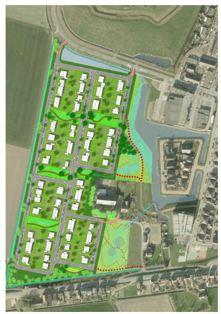 Aan de zuidoostzijde vormen een tweetal bestaande boerderijen en grote groen- en waterstructuren de overgang naar de bestaande woonbebouwing. Aan de noordwestzijde grenst de ontwikkeling aan agrarisch poldergebied, hoewel ook hier in de toekomst wellicht stedelijke ontwikkeling plaats zal vinden.