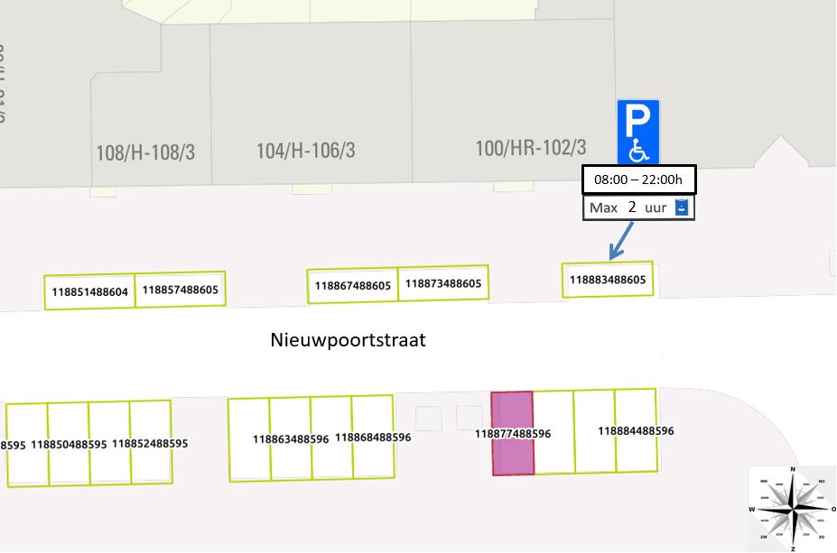 Door het plaatsen van een verkeersbord conform model E6 van Bijlage I van het RVV 1990, inclusief het aanbrengen van twee onderborden met de tekst ’08:00 – 22:00h’ en ’’max 2 uur’’ (+symbool parkeerschijf) in te stellen: Een algemene gehandicaptenparkeerplaats tijdens de op het onderbord genoemde venstertijden inclusief een maximale parkeerduur van 2 uur op het parkeervak met nummer 118883488605 direct ten zuiden van perceel Nieuwpoortstraat 100H.