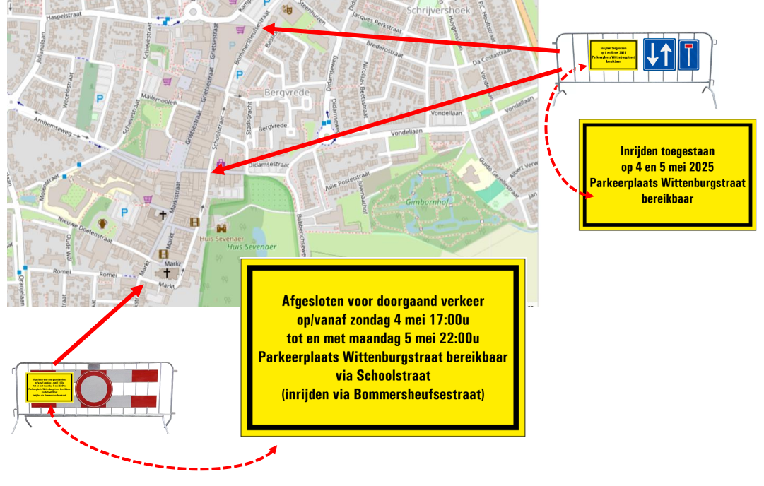 De kruising Markt/Markt, voor de kerk, wordt afgesloten in beide richtingen door middel van het plaatsen van bord C1 van Bijlage I van het Reglement verkeersregels en verkeerstekens 1990, met daarbij een bord met de tekst: "Afgesloten voor doorgaand verkeer op/vanaf zondag 4 mei 17:00 uur tot en met maandag 5 mei 22:00 uur". De parkeerplaats aan de Wittenburgstraat is bereikbaar via de Schoolstraat (inrijden via Bommersheufsestraat).